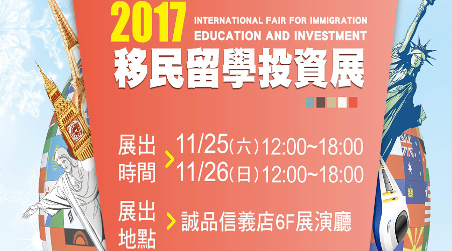 歡迎蒞臨由中華民國移民商業同業公會主辦的2017秋季移民留學投資展,天下留學顧問將在現場提供詳盡的各國留遊學諮詢,想獲得美國留學、德國留學、歐美各國遊學及海外移民等資訊,記得11月25日、11月26日到現場參觀喔!